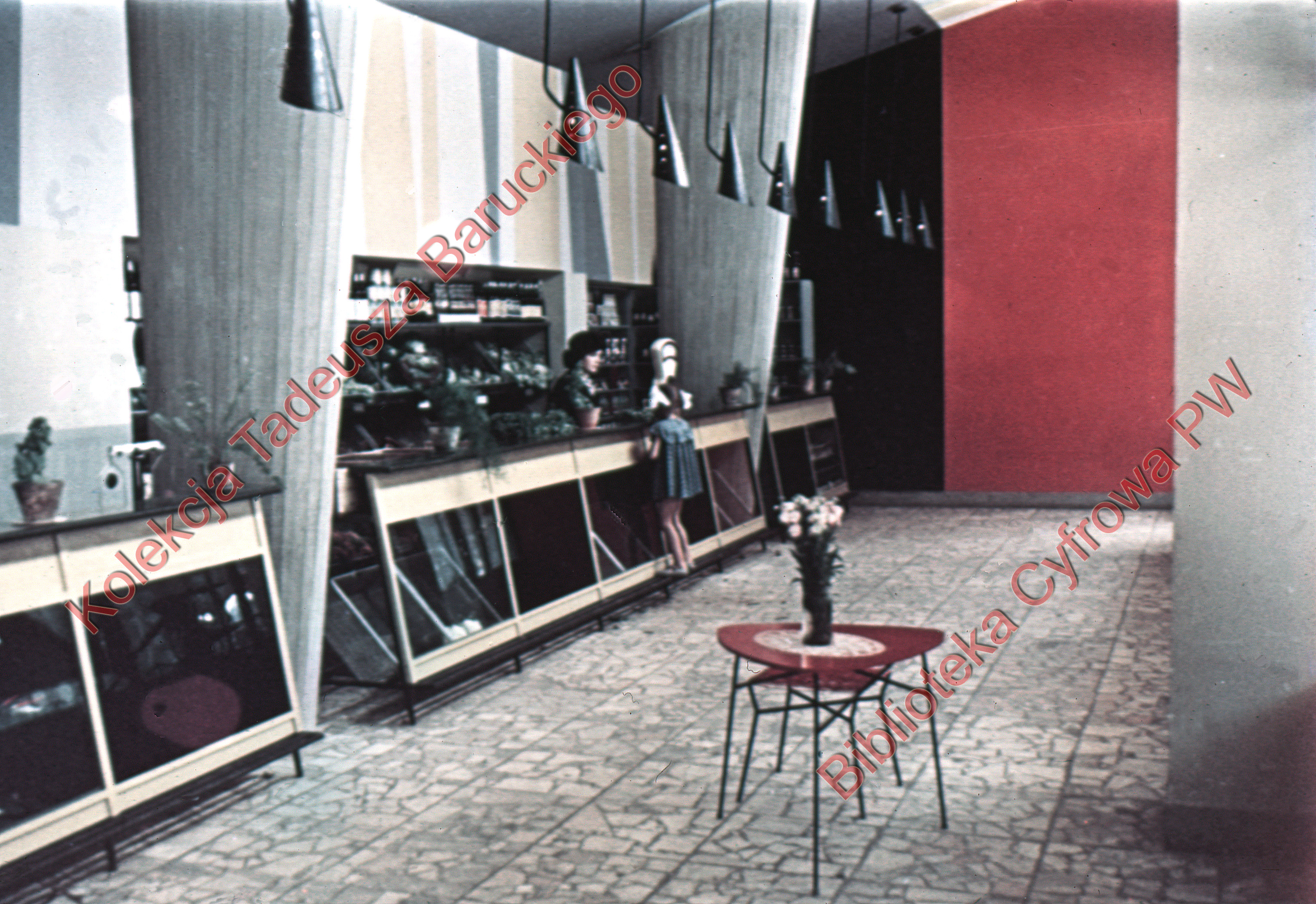 Widoczna dziewczynka przy ladzie ze sprzedawczynią, wystawiony na półkach towar. Na ladzie waga i kwiaty w doniczkach, na środku pomieszczenia stolik z kwiatami, podwieszone od sufitu lampy oświetleniowe, kolumny.