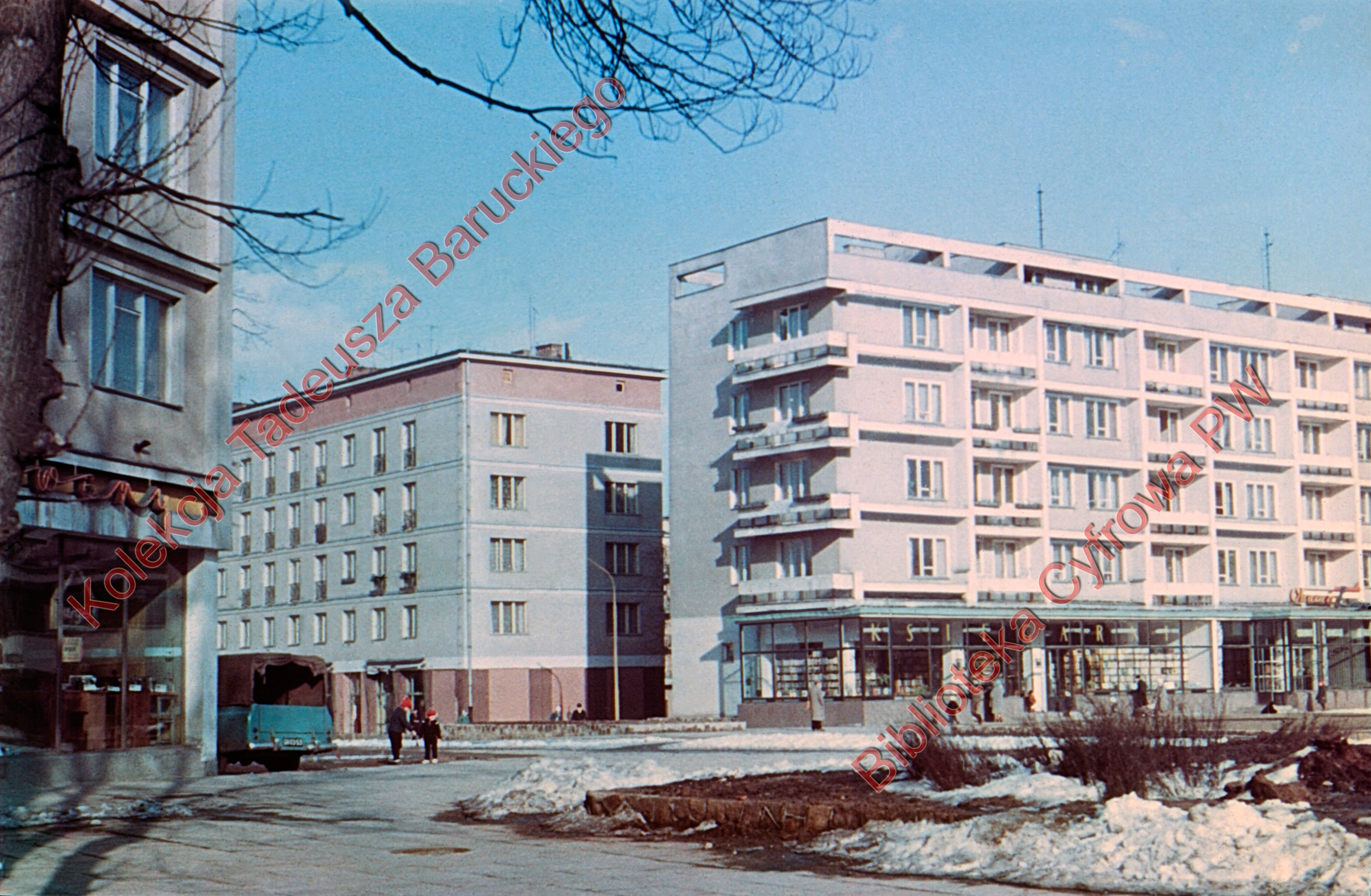 Budynki mieszkalne z ciągiem sklepów, handlu i usług na parterze: księgarnia, sklep obuwniczy, neony Obuwie LUX i drugi nieczytelny na sąsiednim budynku. Widoczny również zaparkowany samochód ciężarowy, na chodniku dzieci.