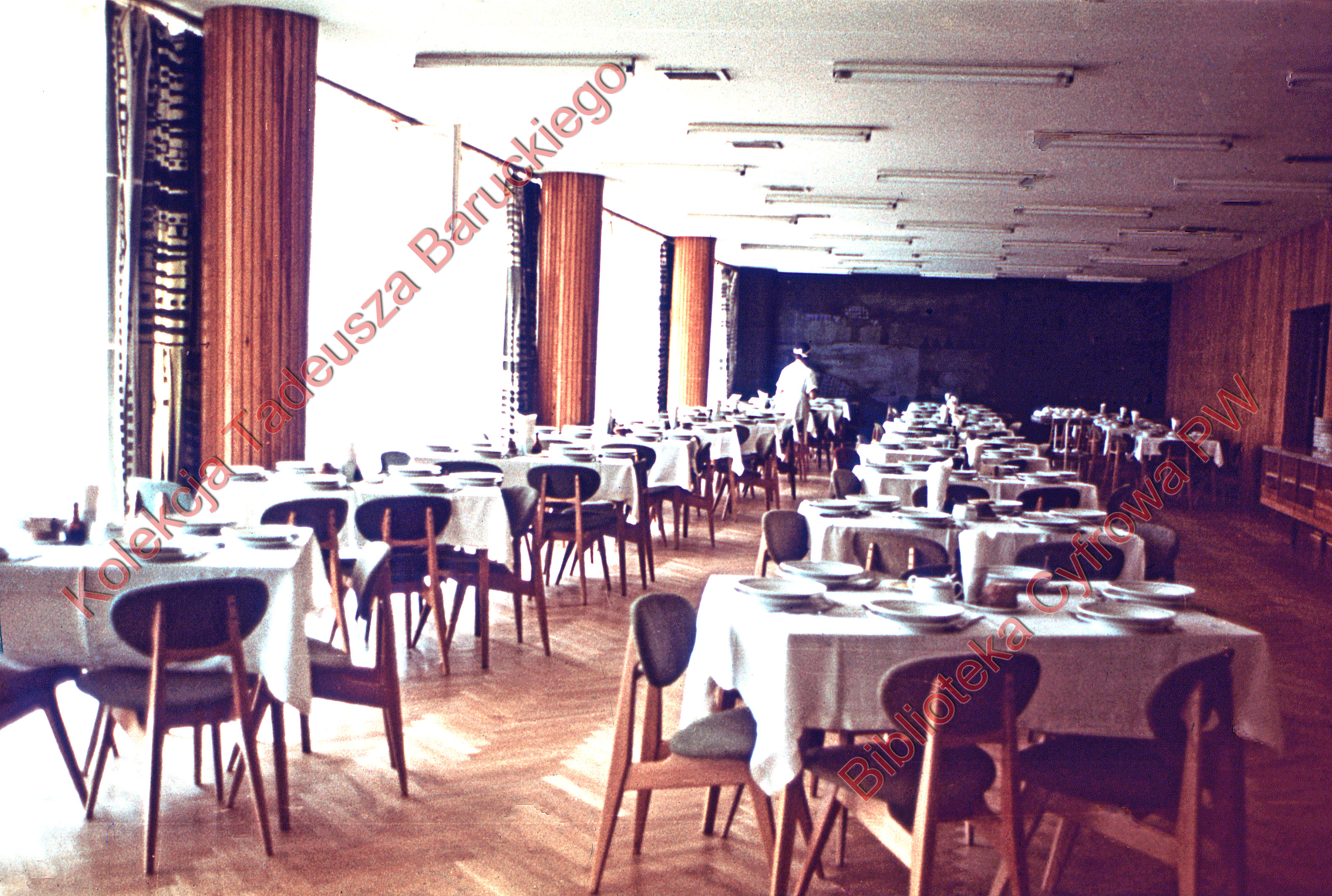 Na ścianie malowidło, w sali nakryte stoliki oraz pani z obsługi.