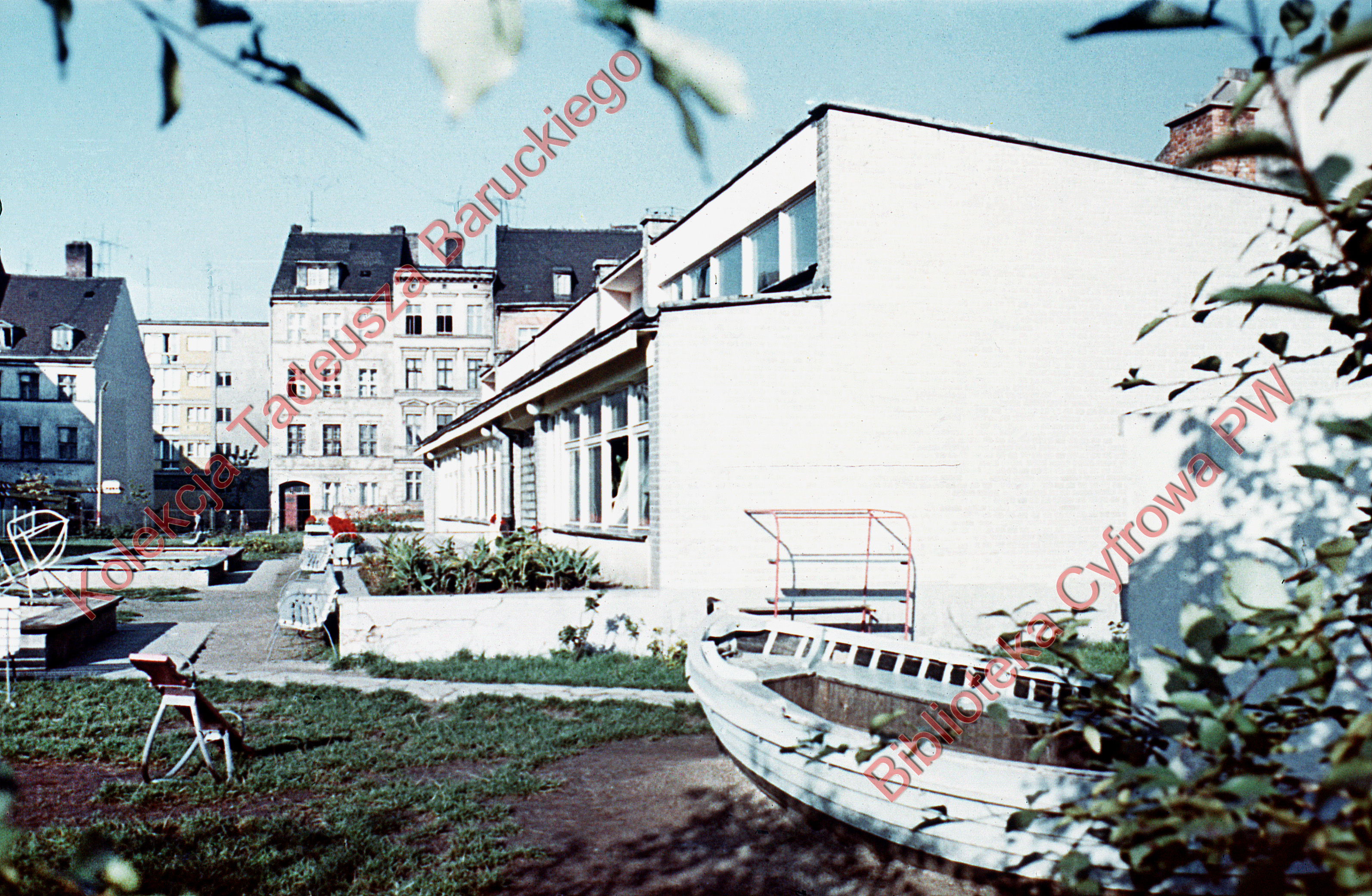 Opis:Widoczna łódka, ławki, piaskownice, w tle budynki mieszkalne.