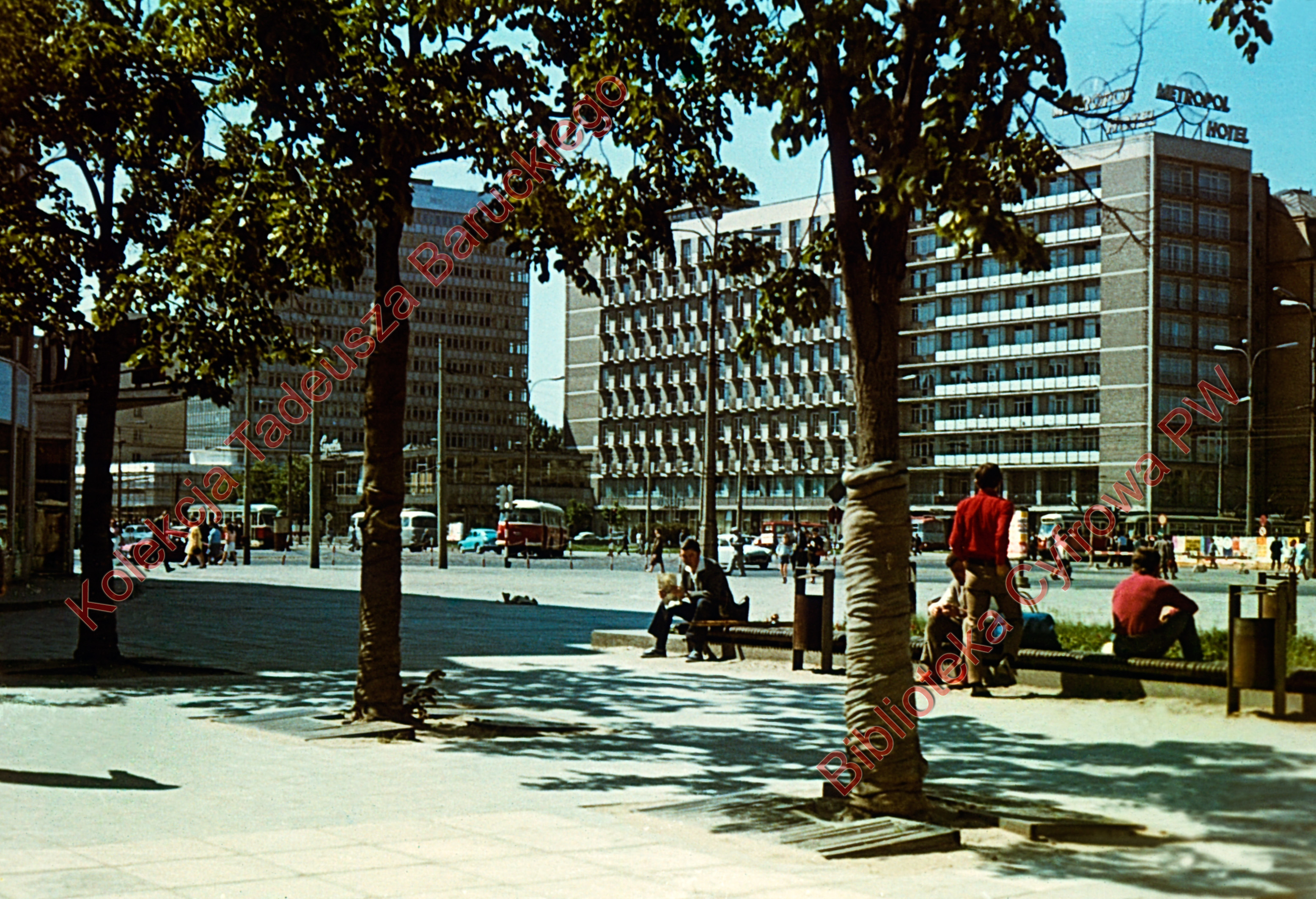 Widoczne drzewa na chodniku i ludzie siedzący na ławkach, na rondzie tramwaje i autobusy.