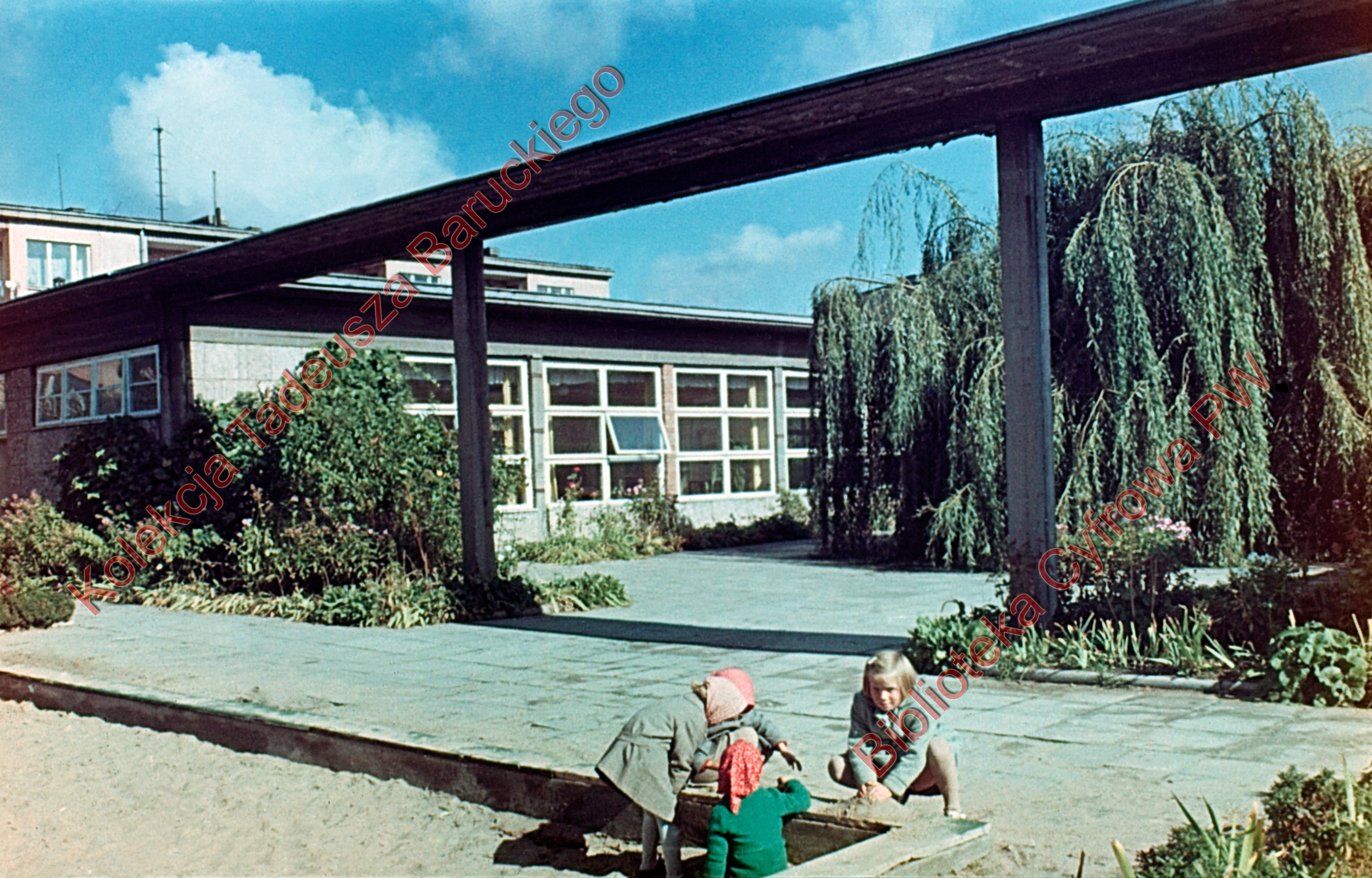 Opis:Widoczne dziewczynki bawiące się w piaskownicy.