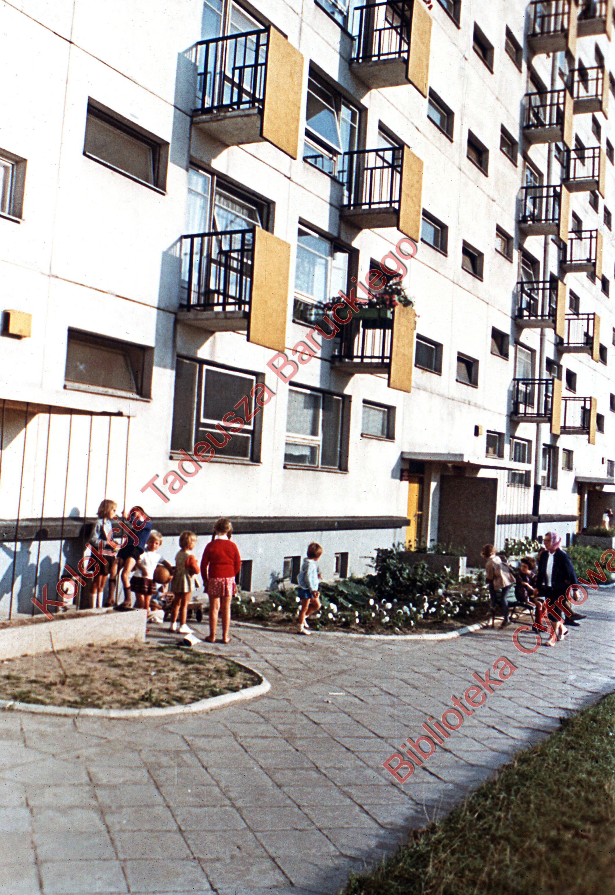 Przed wejściem do klatki schodowej widoczna grupka dzieci.