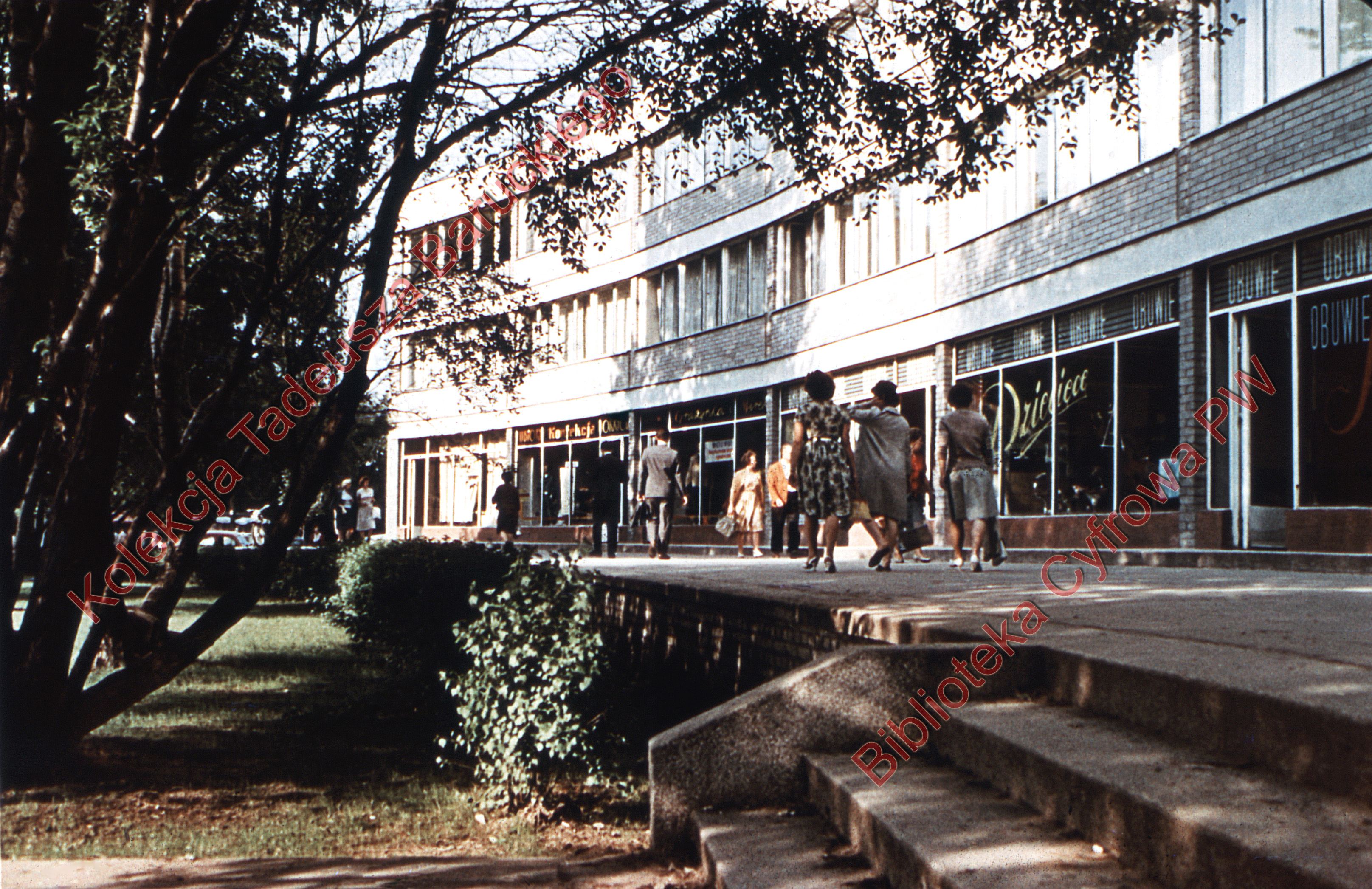 Widoczny sklep obuwniczy oraz teren zielony z drzewami.