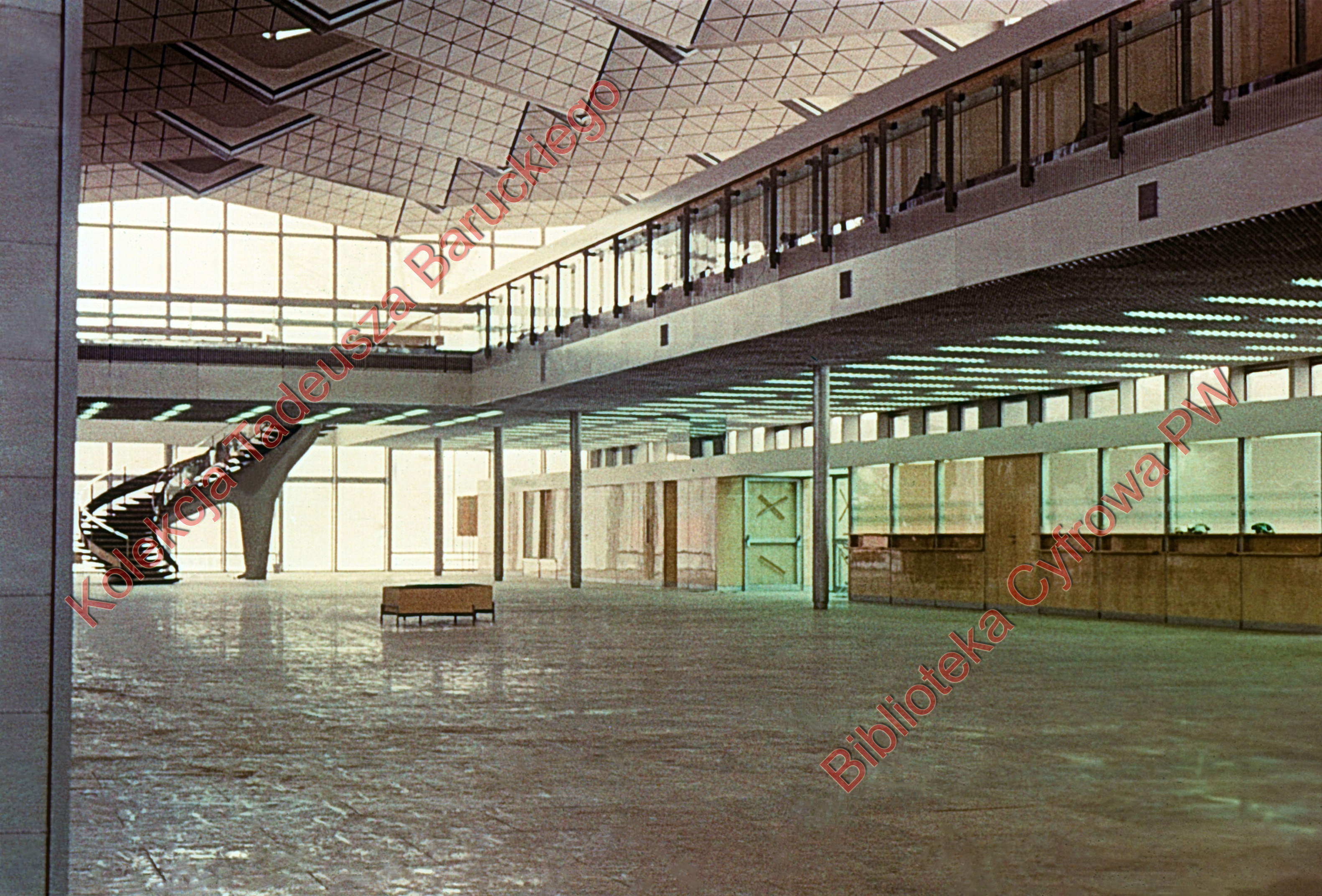 Międzynarodowy Port Lotniczy na Okęciu przy ulicy Żwirki i Wigury, wnętrze hali pasażerskiej ze schodami, Warszawa