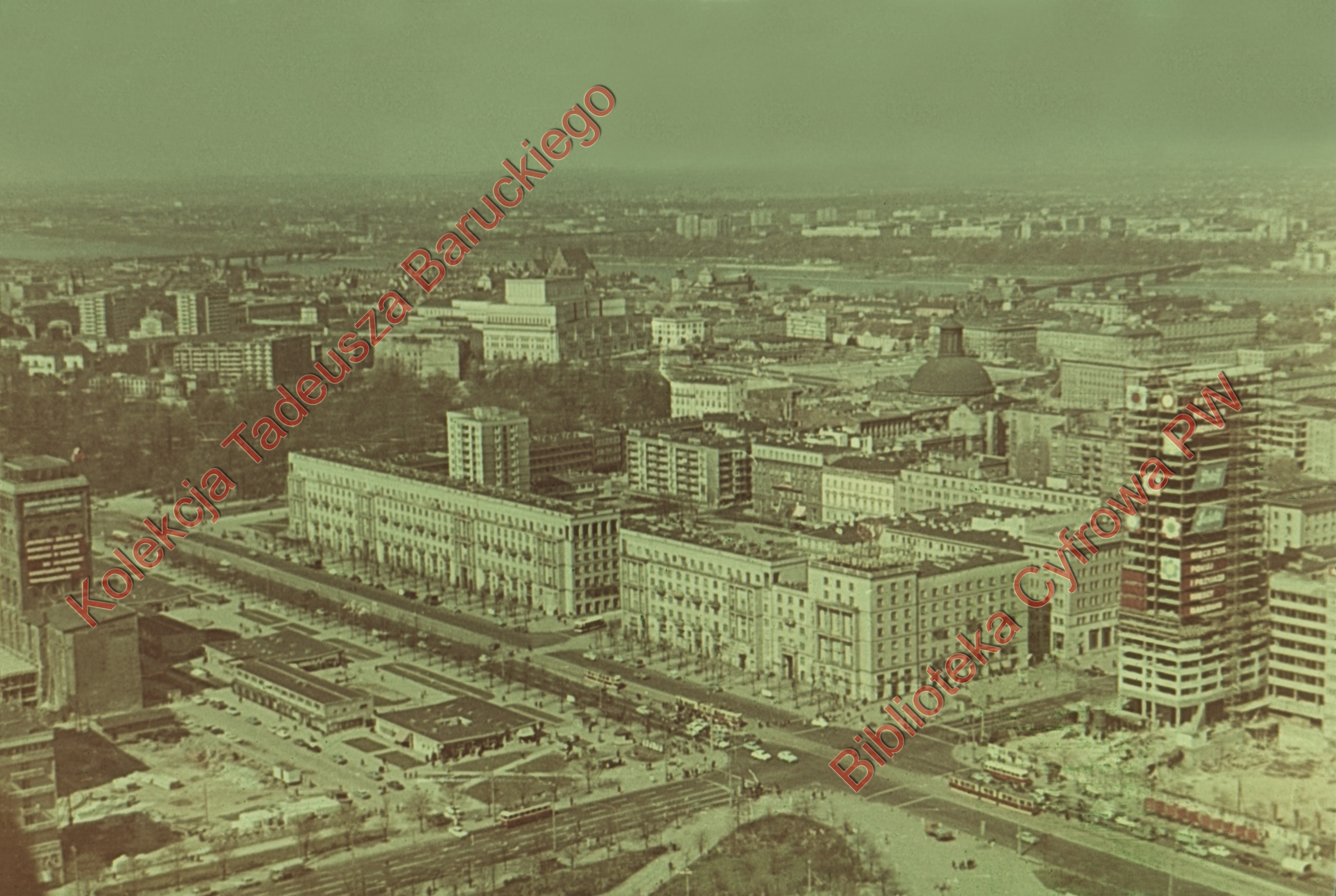 Widok panoramiczny zabudowy ulicy Marszałkowskiej w kierunku ulicy Królewskiej z Pałacu Kultury i Nauki (PKiN), Warszawa