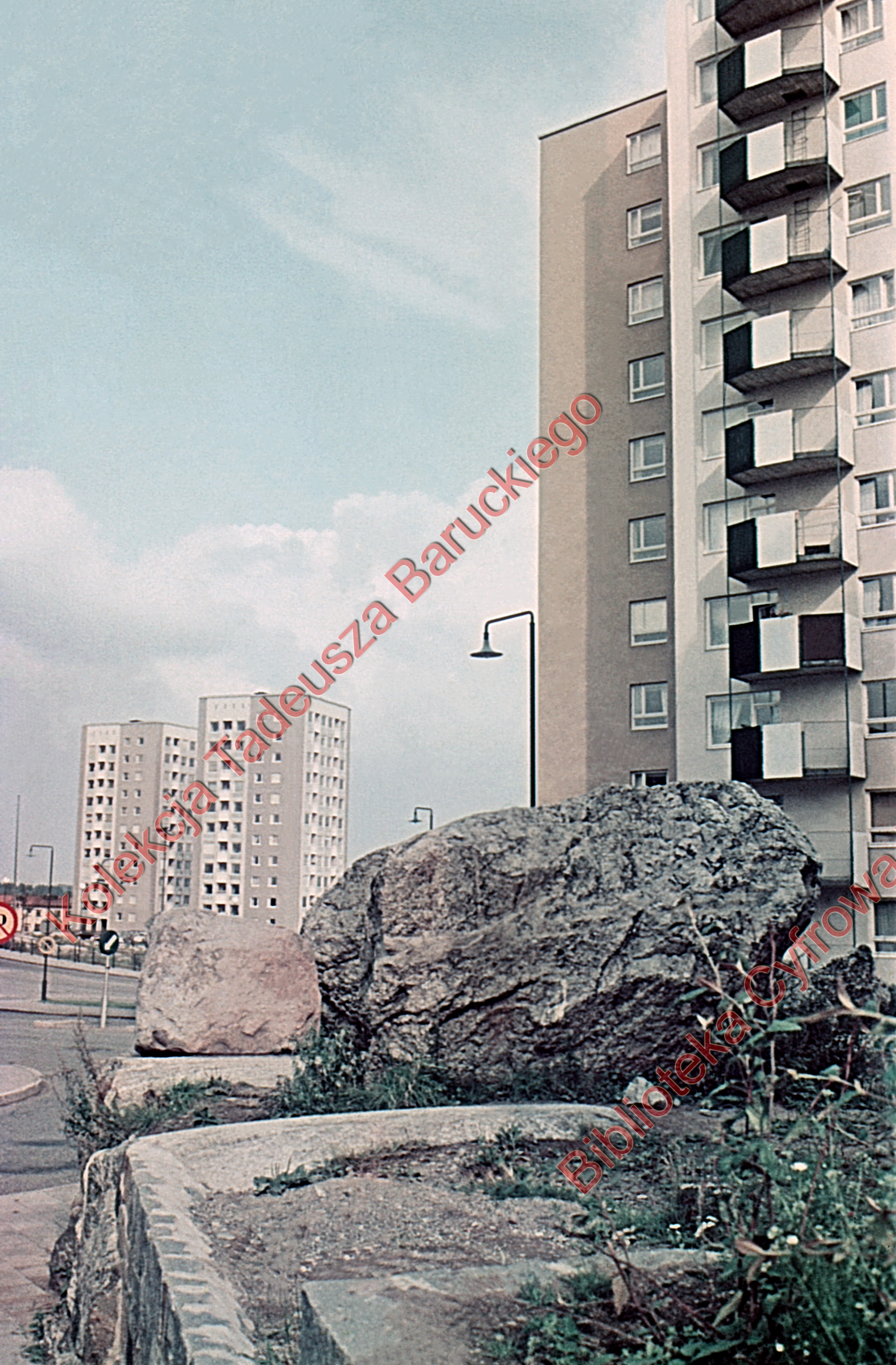 Na pierwszym planie przy jednym z wieżowców widoczny duży kamień.