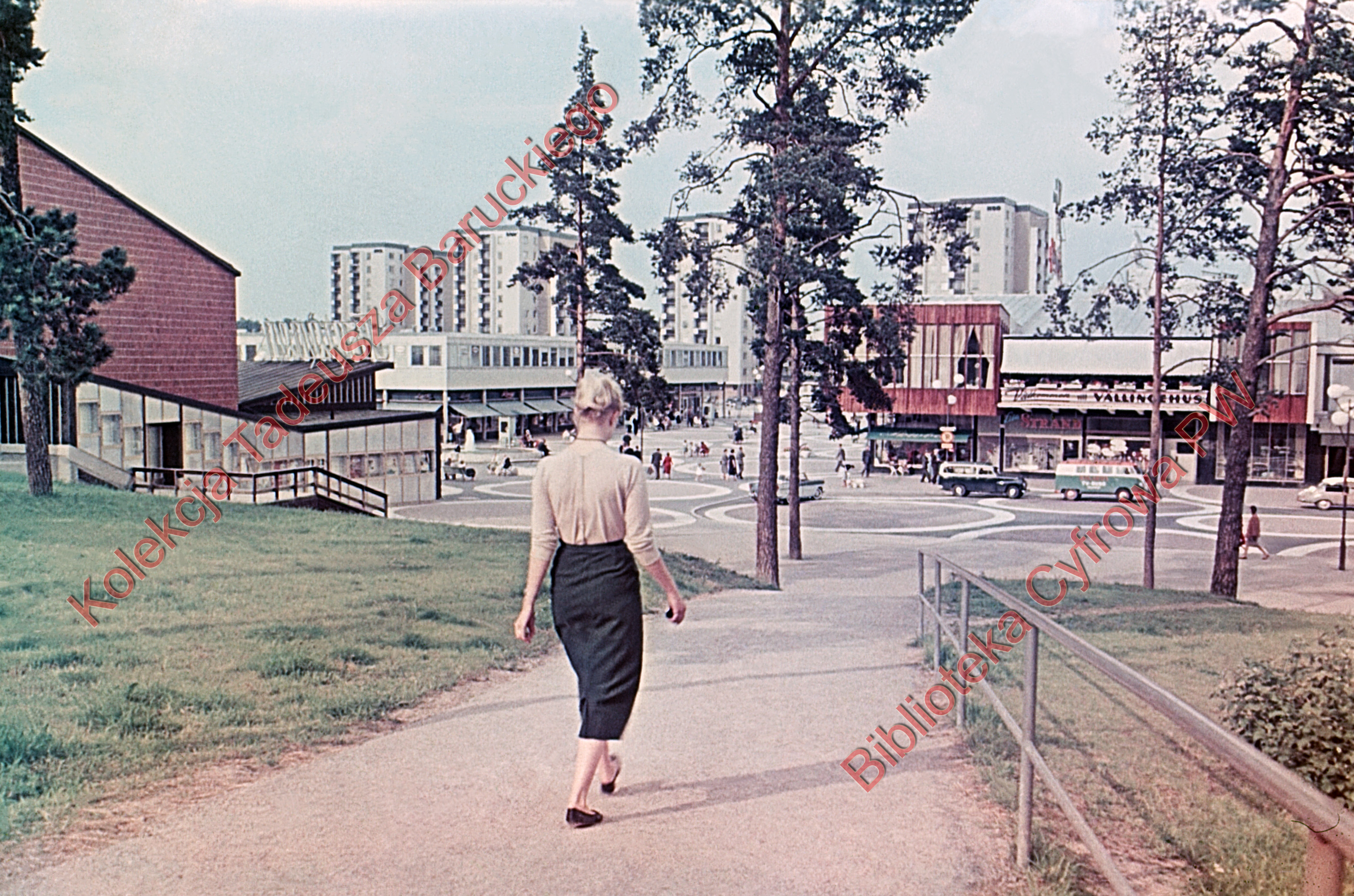 Na pierwszym planie widoczna kobieta schodząca dróżką ze skarpy. W głębi mieszczą się wieżowce mieszkalne oraz Centrum Handlowe Vällingby. Z lewej strony widoczny fragment elewacji bocznej budynku Kina Fontänen.