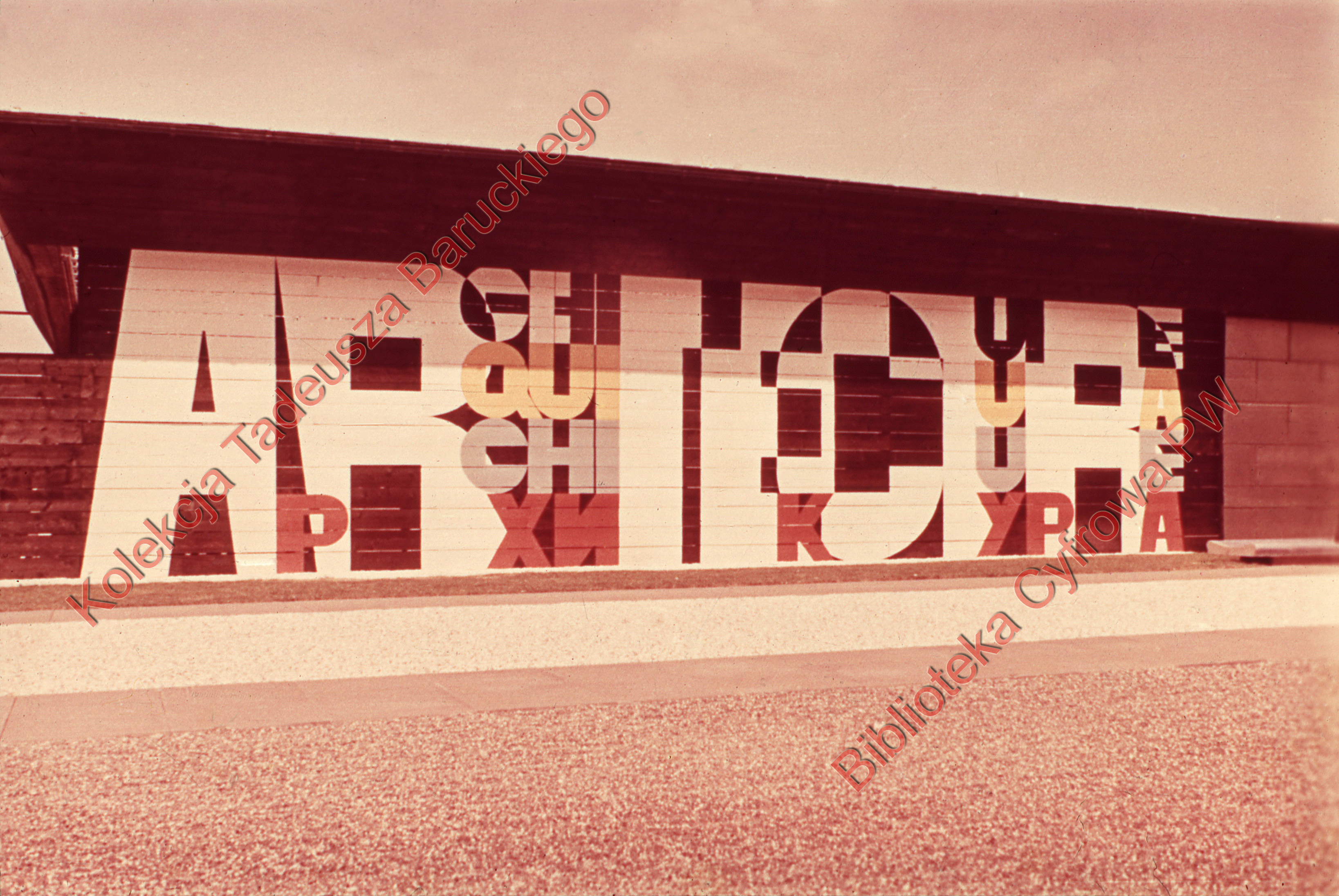 VI Kongres UIA, fragment elewacji pawilonu wystawowego z napisem "Architecture" w czterech językach, Londyn, Wielka Brytania