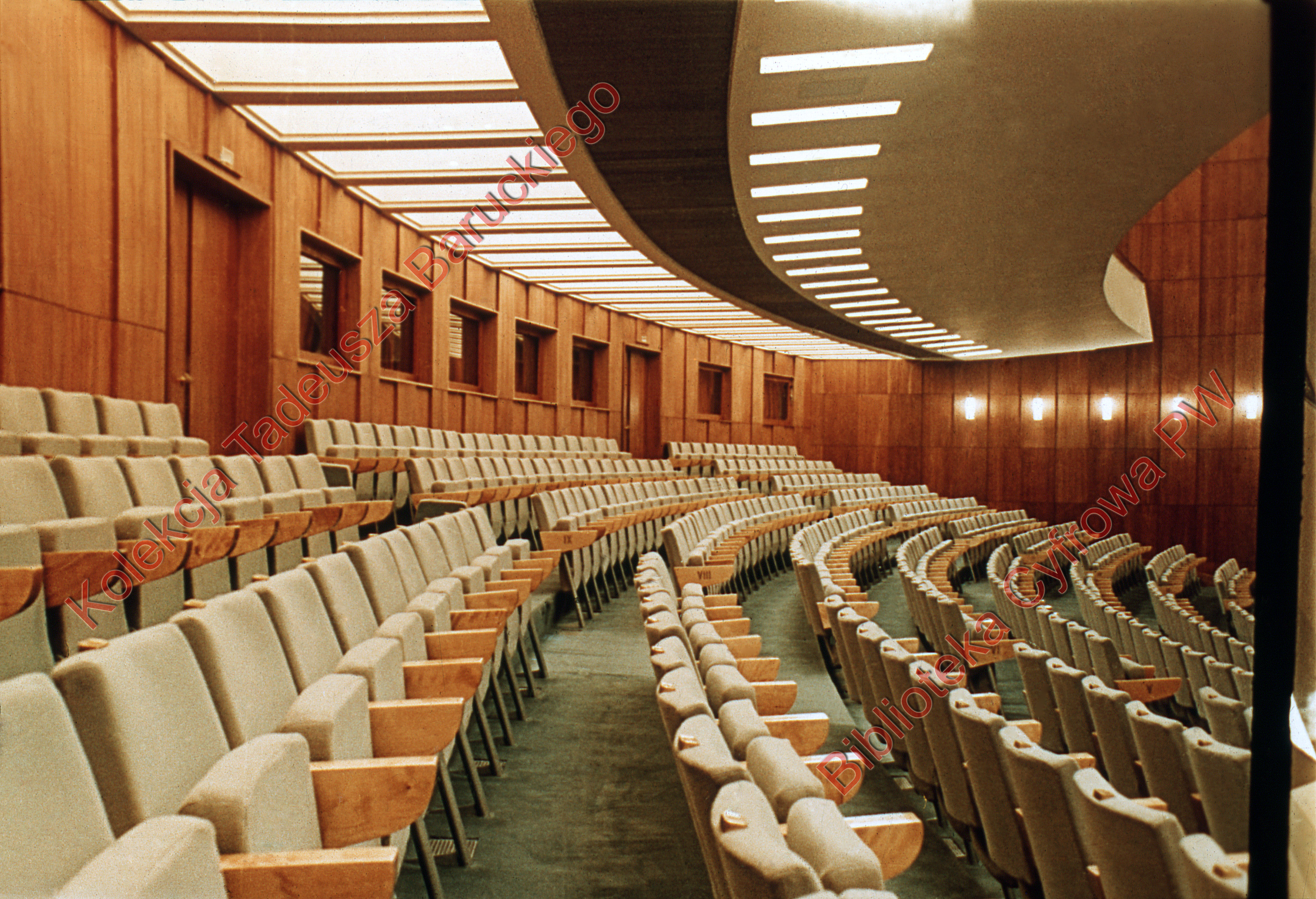 Widoczne rzędy foteli oraz podświetlony balkon.
