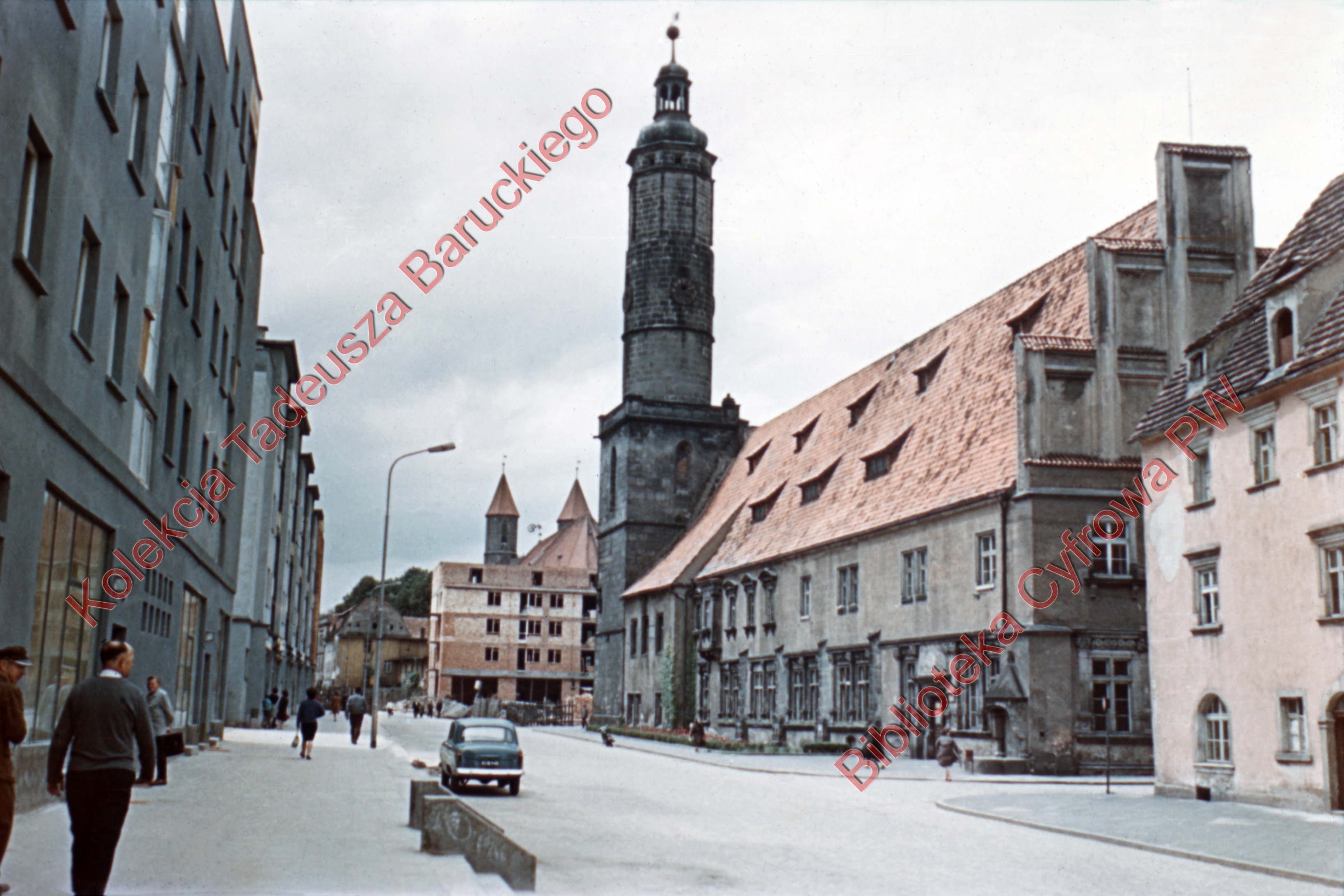 W głębi wieża ratusza, na końcu ulicy widoczny nowopowstający budynek.