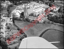 Title: Kościół Najświętszego Zbawiciela Wszystkich Świętych z fragmentem zabudowy miasta. Widok lotniczy od strony południowej. Dobre Miasto