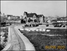 Teren pod budynki na tle zabudowań miejskich.