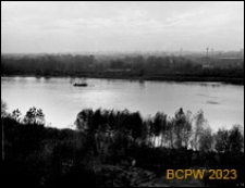 Panorama Wisły. Po obu stronach rzeki zadrzewione brzegi. W głębi na przeciwległym brzegu rzeki widoczny Torwar i tereny sportowe WKS Legia. Na rzece pogłębiarka.