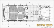 Rzut pierwszego piętra z zaznaczeniem widowni, poczekalni, sali konsumentów, bufetu, magazynów.