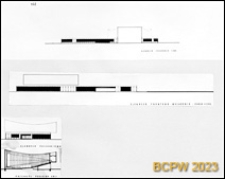 Rysunki schematyczne elewacji zachodniej, frontowej wschodniej, południowej. Przekrój podłużny.