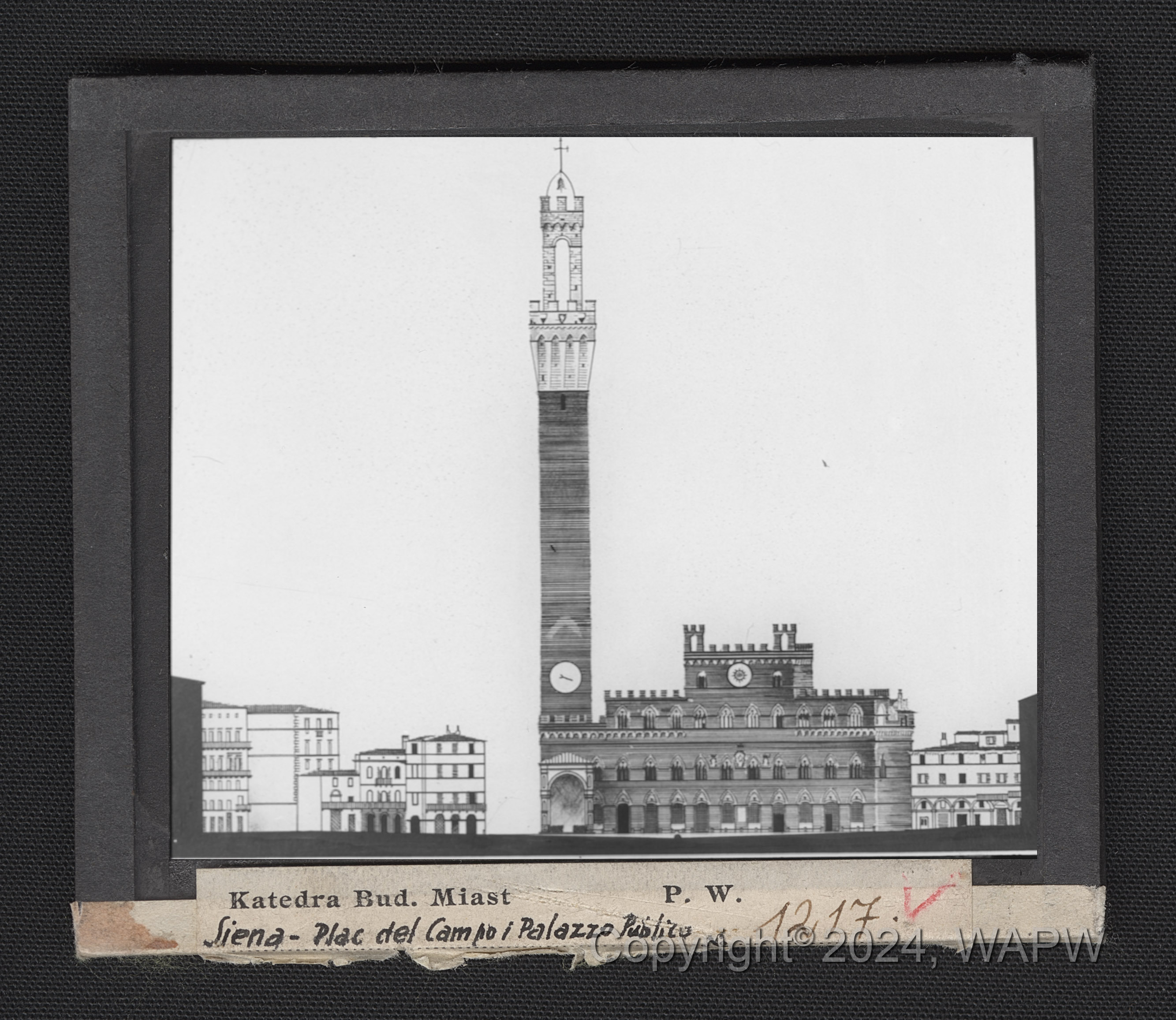 Rysunek techniczny pałacu z dzwonnicą Torre del Mangia, w otoczeniu innych budynków mieszczących się na placu.
