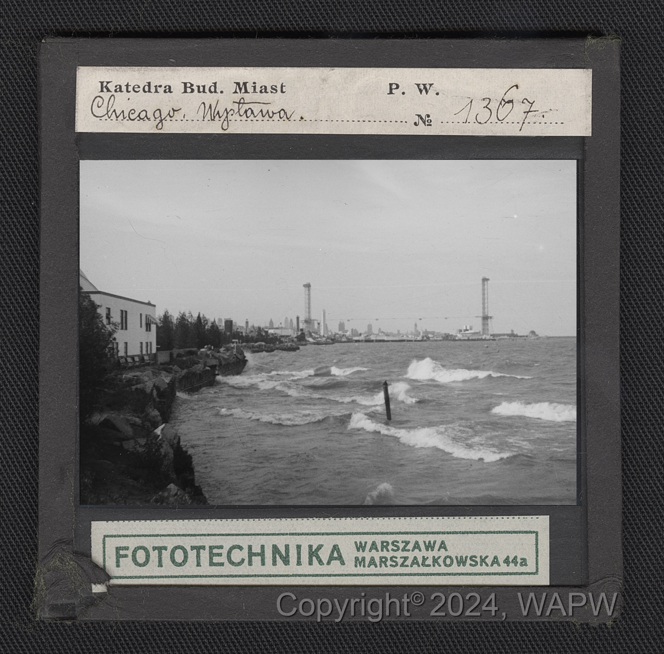 Na pierwszym planie widoczne fale jeziora Michigan. Na brzegu stoi dwukondygnacyjny budynek. W tle zabudowa miejska.