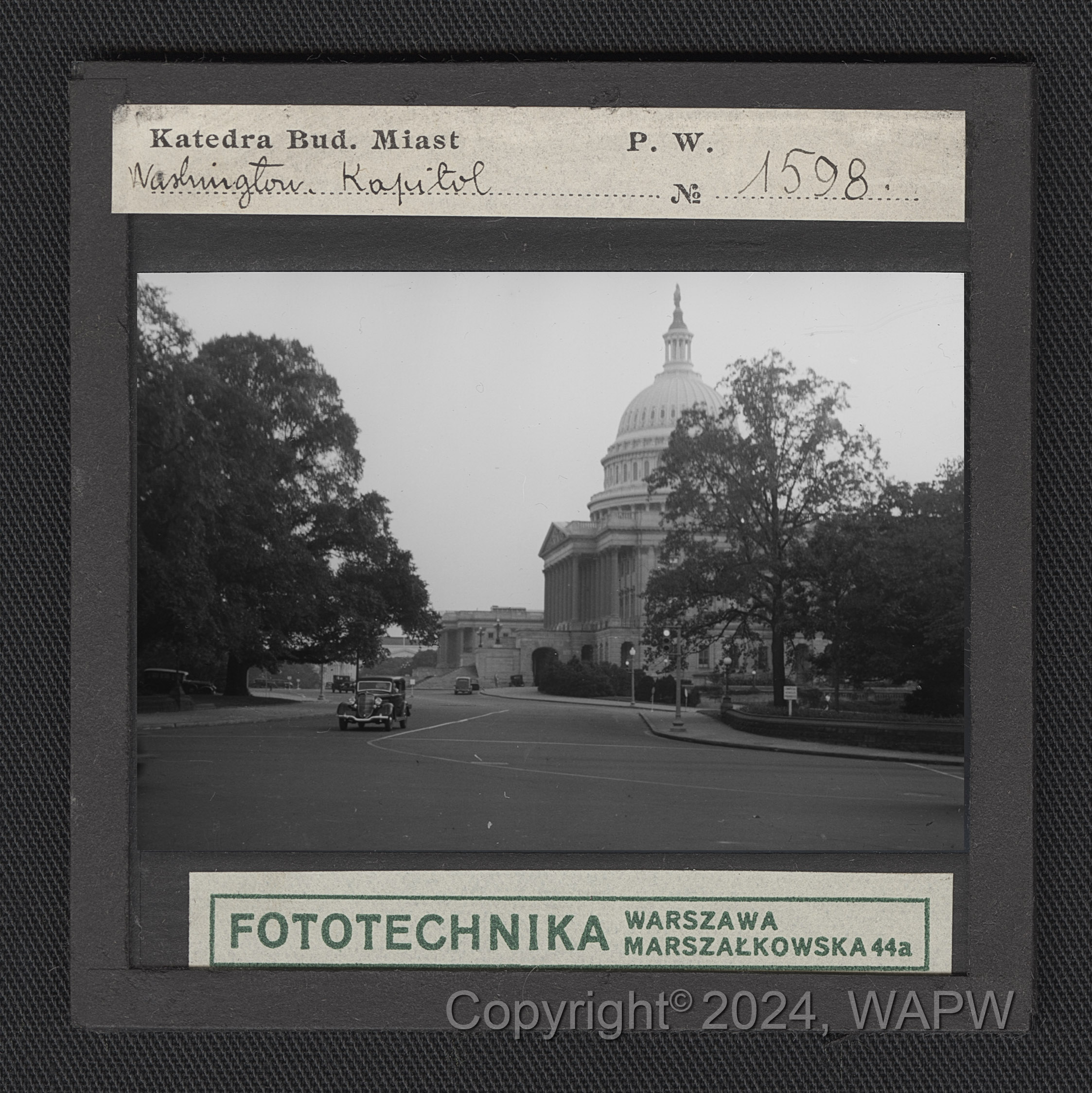 Na pierwszym planie szeroka ulica z poruszającymi się samochodami. W głębi widoczny okazały gmach Kapitolu.