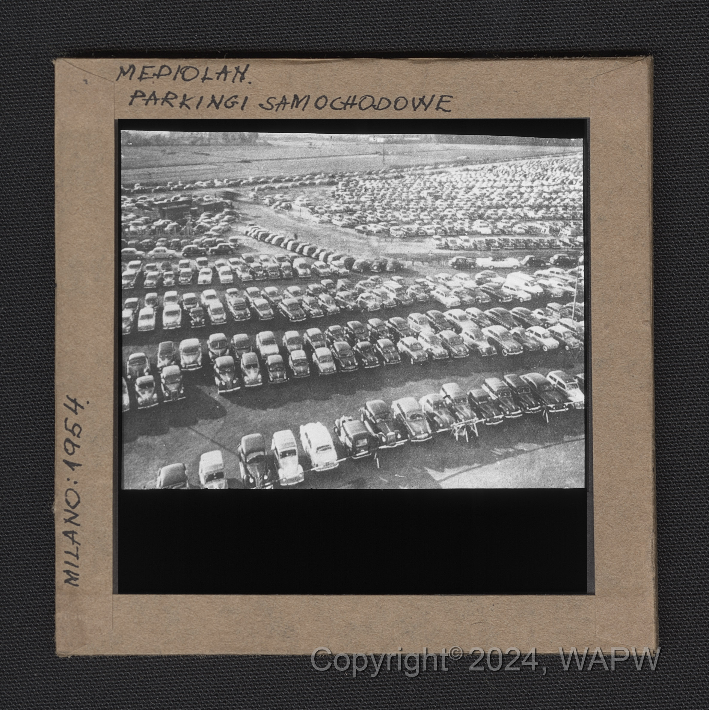 Na slajdzie widoczne zaparkowane w równych szeregach samochody osobowe.