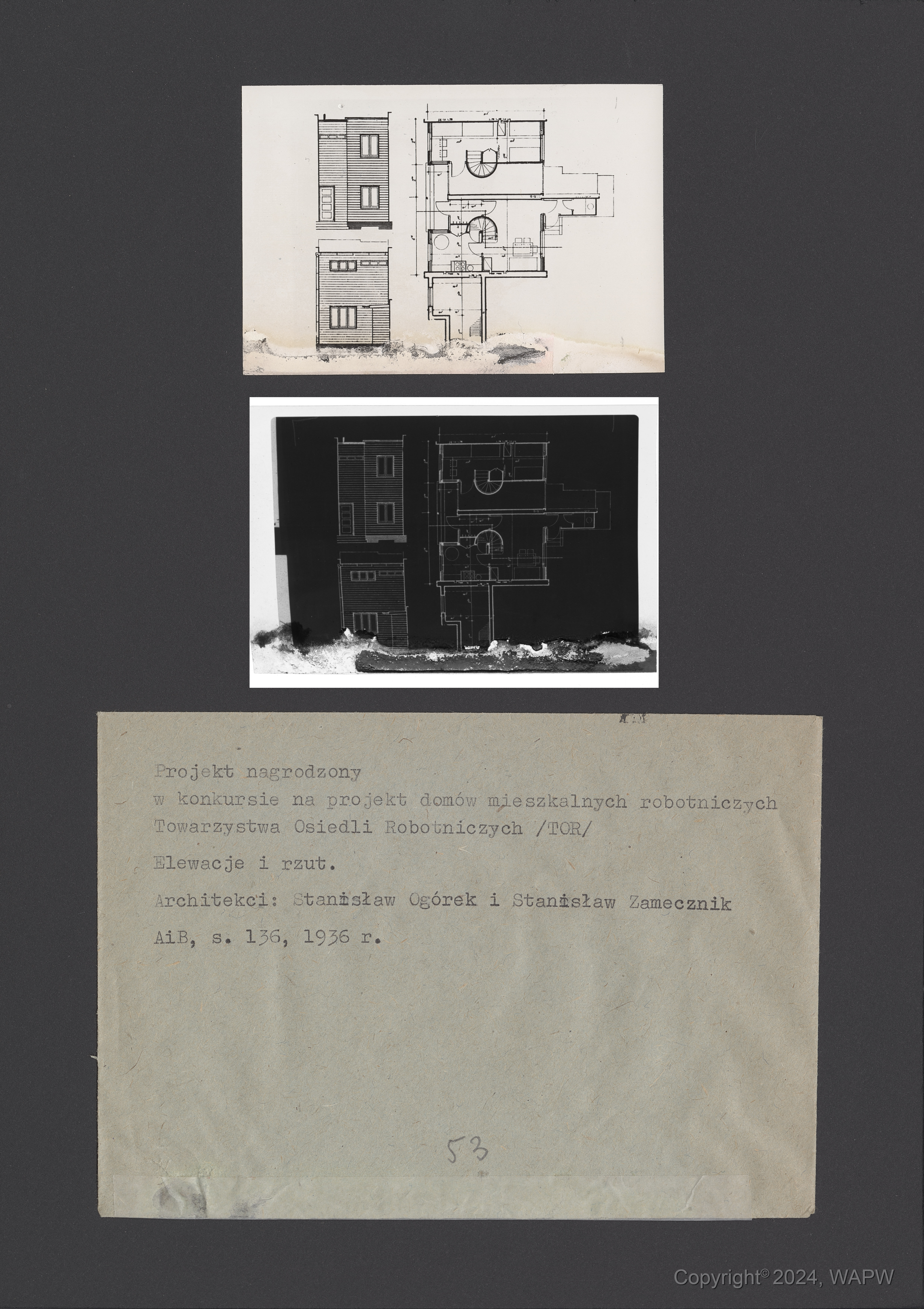 Z lewej strony zdjęcia dwa rysunki fragmentów elewacji budynku. Z prawej rzut mieszkania.