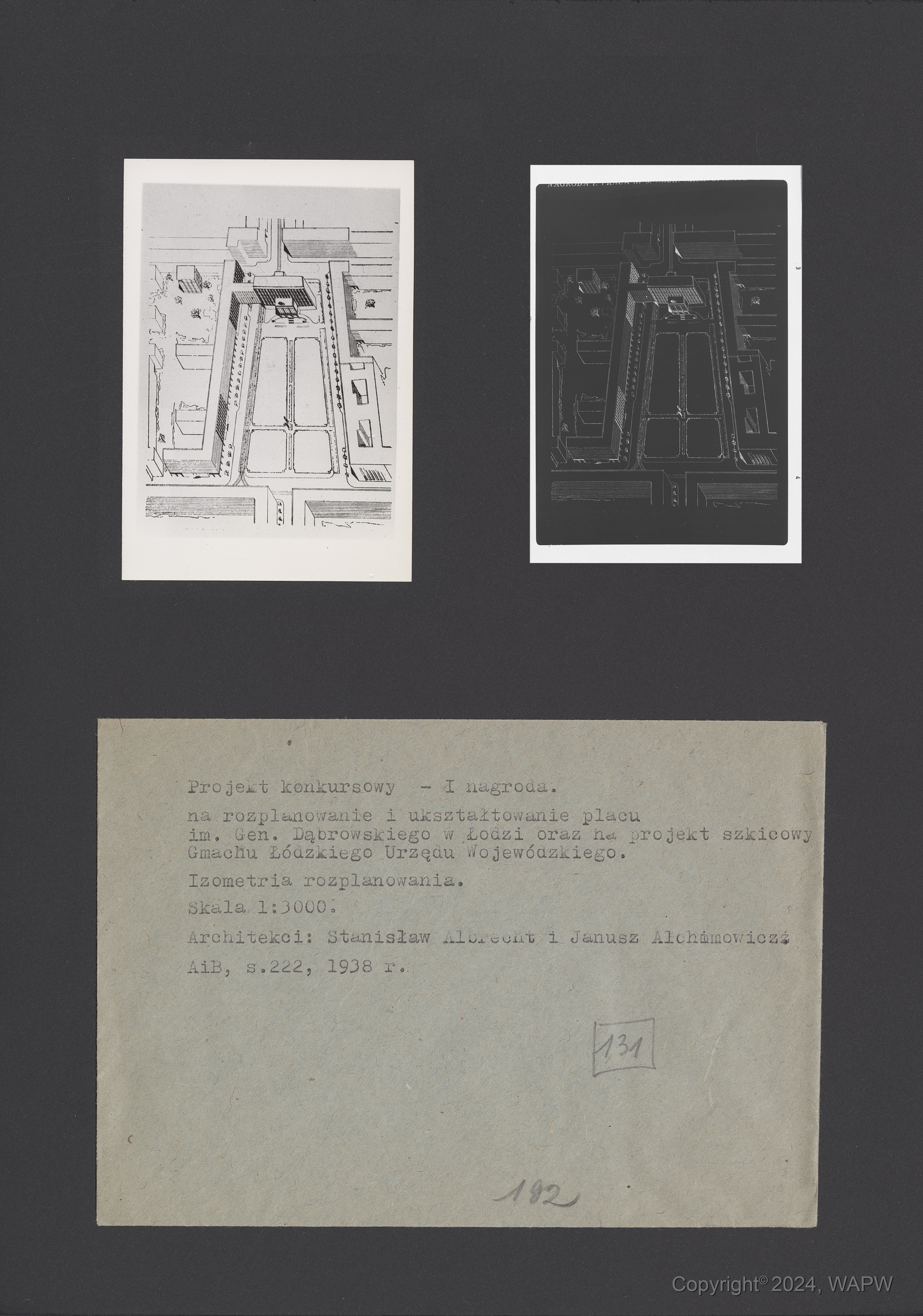 Tytuł: Projekt na rozplanowanie i ukształtowanie Placu im. Generała Dąbrowskiego w Łodzi oraz projekt szkicowy gmachu Łódzkiego Urzędu Wojewódzkiego - Konkurs SARP nr 103 : praca nr 6, I nagroda. Zdj. 1, Izometria rozplanowania