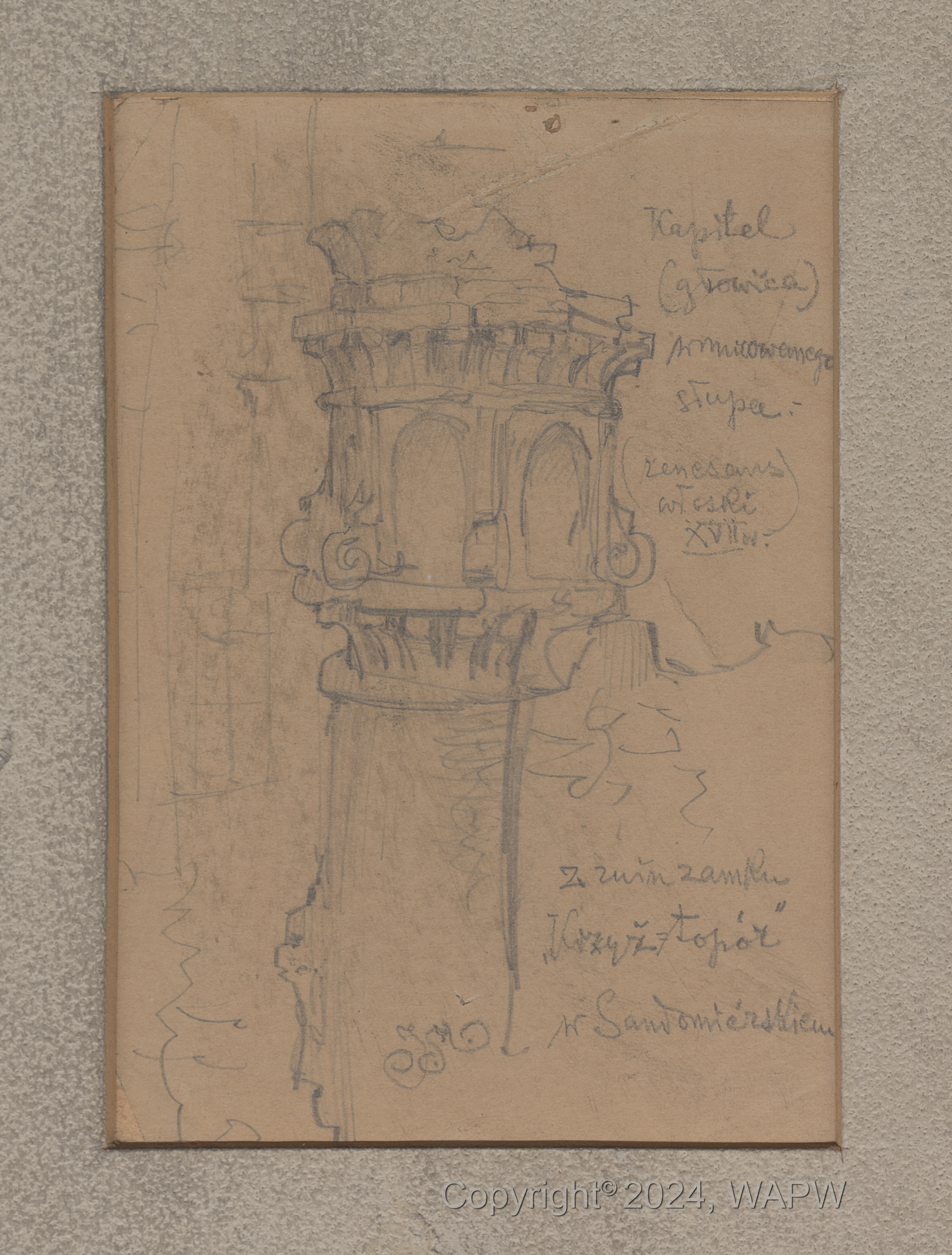 Rysunek bogato rzeźbionego kapitelu kolumny.