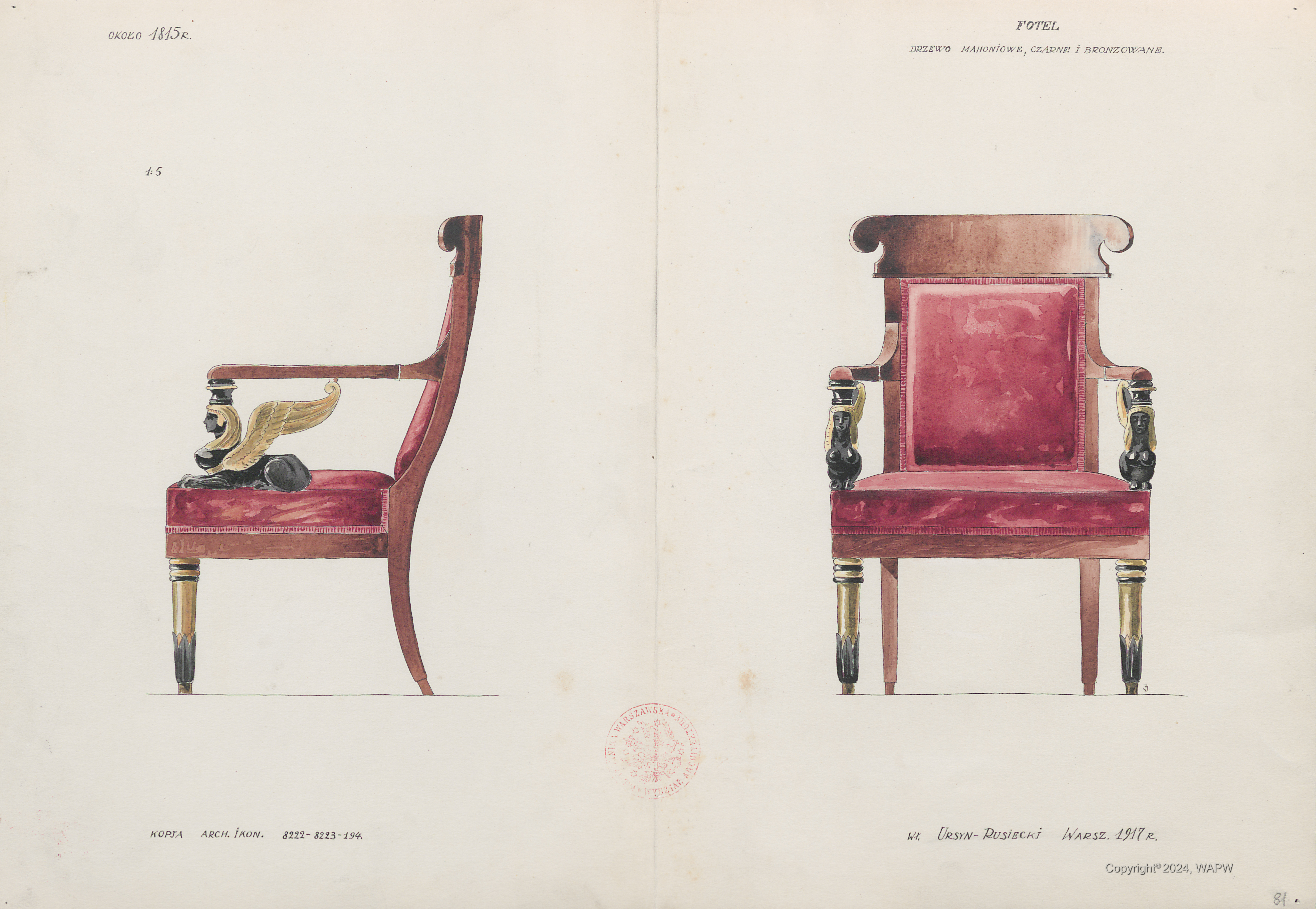Fotel : drzewo mahoniowe, czarne i bronzowane: około 1815 r. : 1:5
