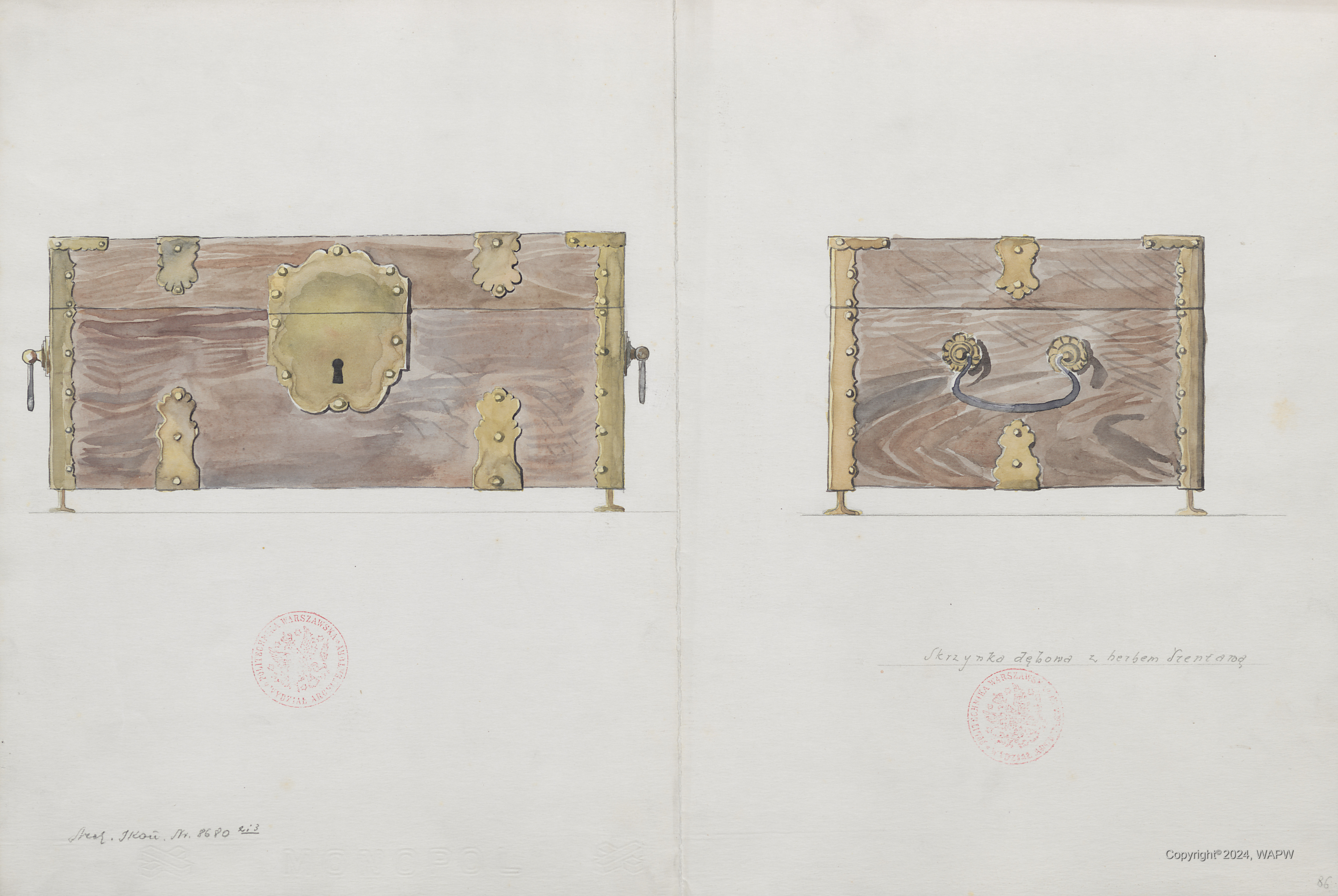Okuty kufer w widoku od przodu i z boku.