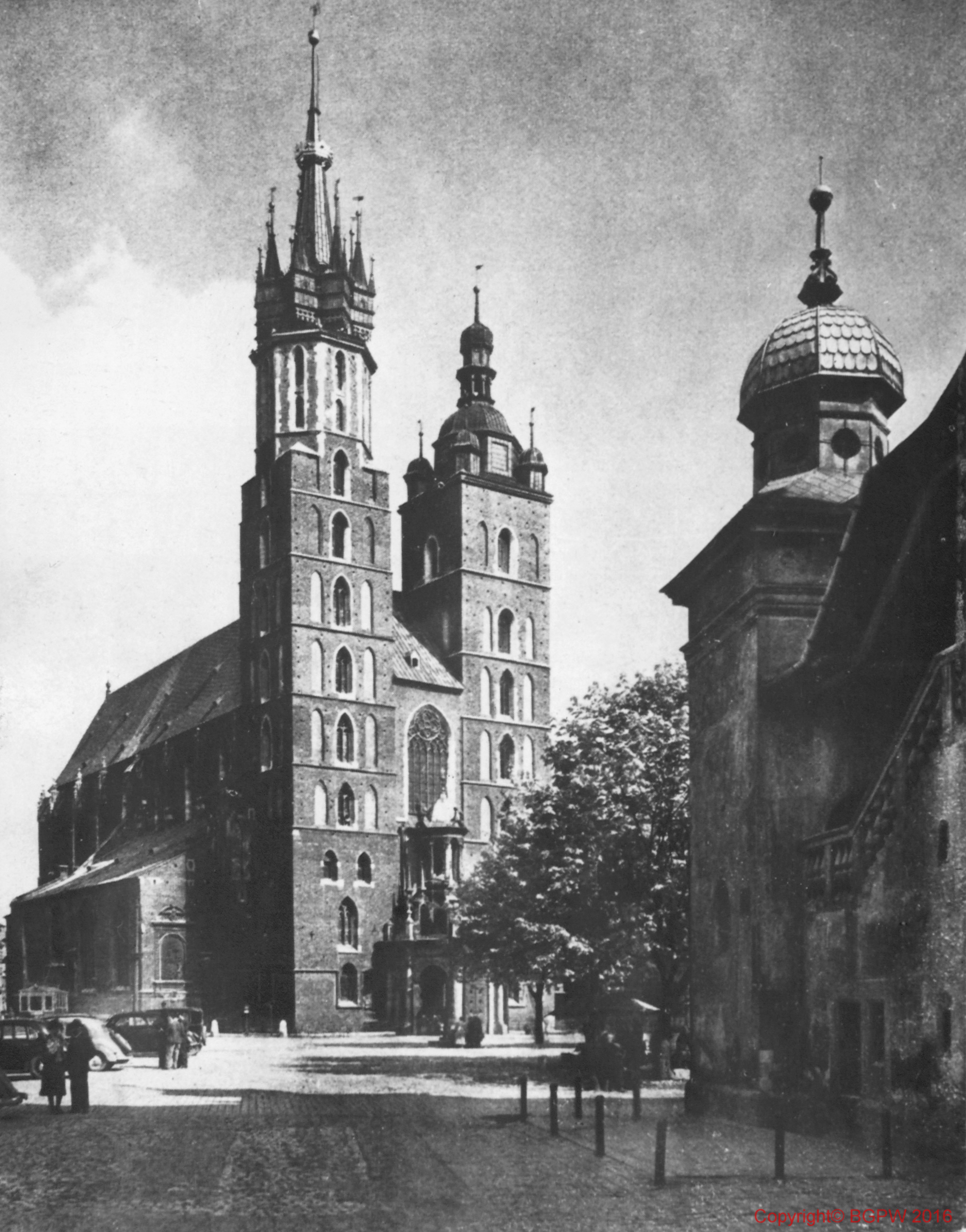 Kościół parafialny NMP (Mariacki). Widok ogólny od strony fasady głównej z przed 1944 roku. Kraków