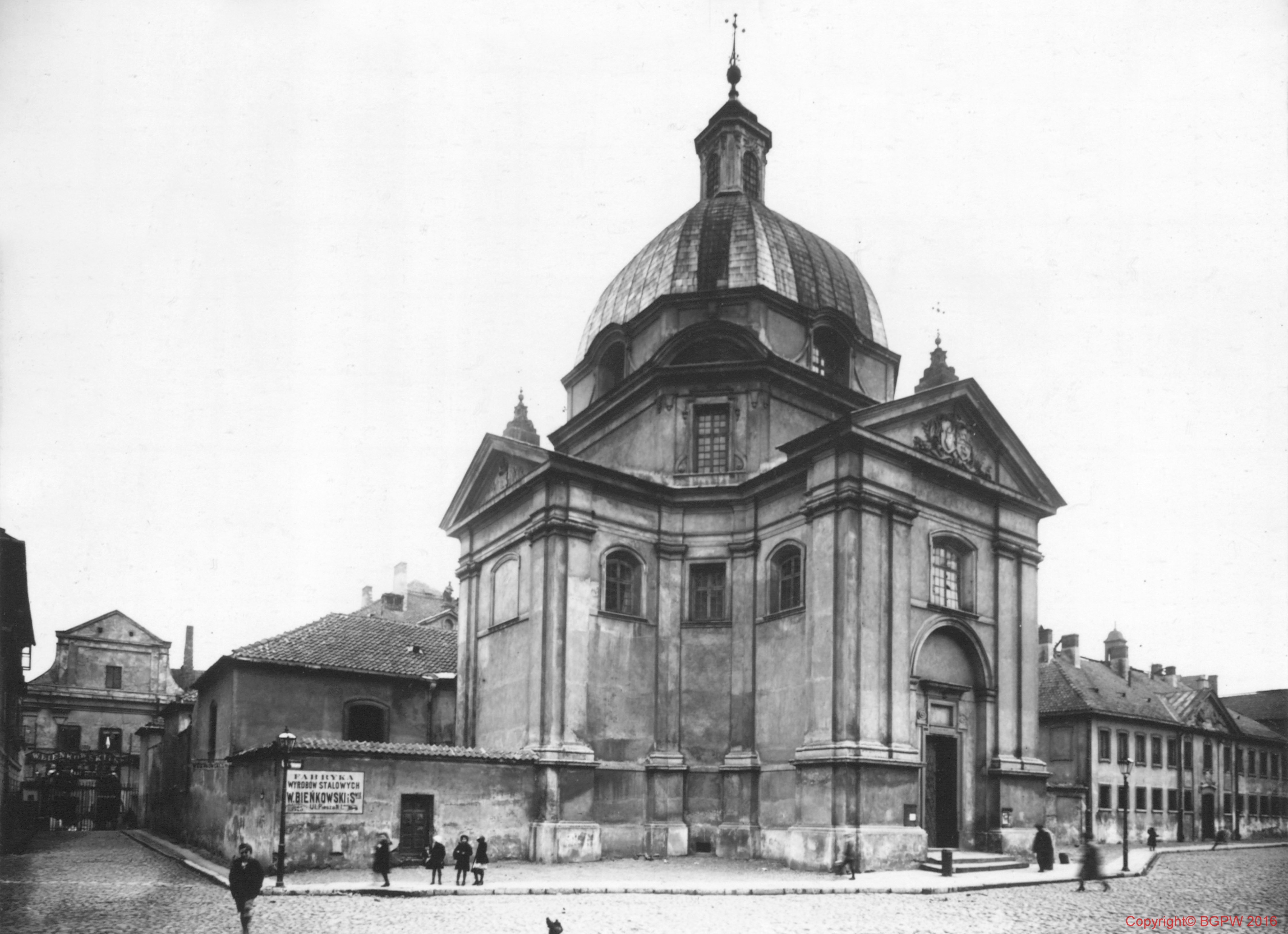 fot. czarno-biała ; Data budowy: 1688-1692 (kościół); 1740 (klasztor); 1944 zburzone; 1949-1955 odbudowa ; Osoby związane z obiektem: Tylman z Gameren (proj. kościoła); Solari Antoni (proj. klasztoru) ; W głębi widoczna fasada kościoła redemptorystów zamienionego na fabrykę wyrobów stalowych W. Bieńkowskiego. Na murze kościelnym reklama tejże fabryki