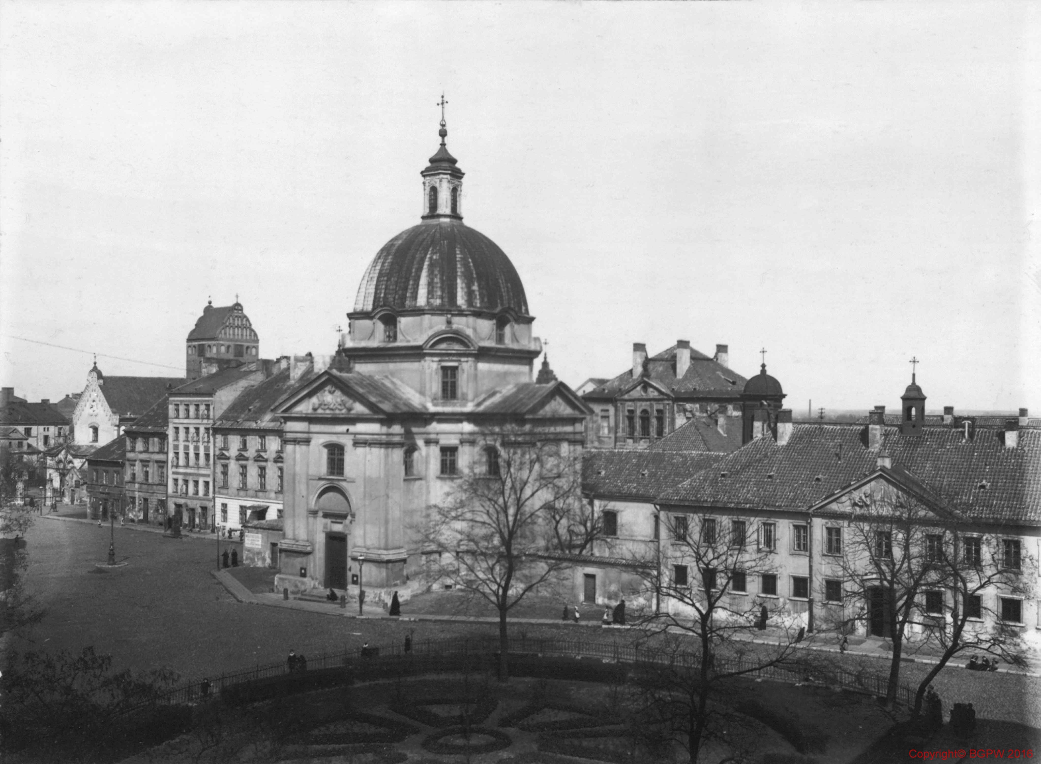 Description:fot. czarno-biała ; Data budowy: 1688-1692 (kościół); 1740 (klasztor); 1944 zburzone; 1949-1955 odbudowa ; Osoby związane z obiektem: Tylman z Gameren (proj. kościoła); Solari Antoni (proj. klasztoru)