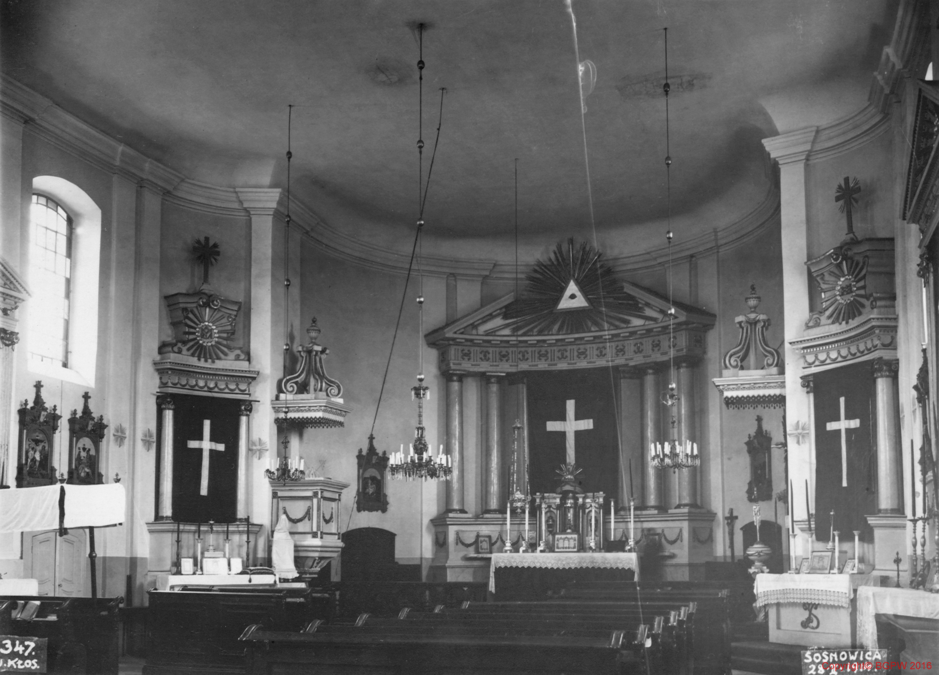 Kościół pw. Trójcy Świętej. Wnętrze. Widok w kierunku prezbiterium z 1914 roku. Sosnowica
