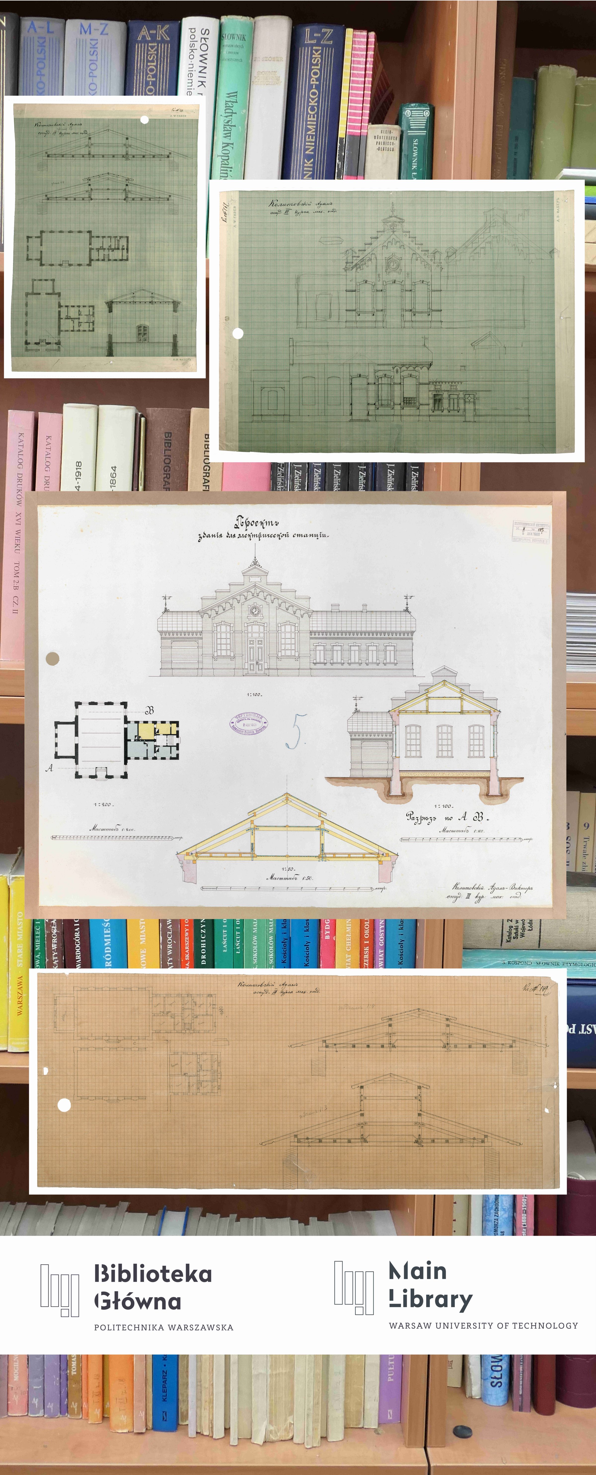 Title: Znalezione za regałem. Adam Wiktor Kolitowski. Prace studenta z przełomu XIX/XX wieku. Plakat z rysunkami projektu budynku stacji elektrycznej