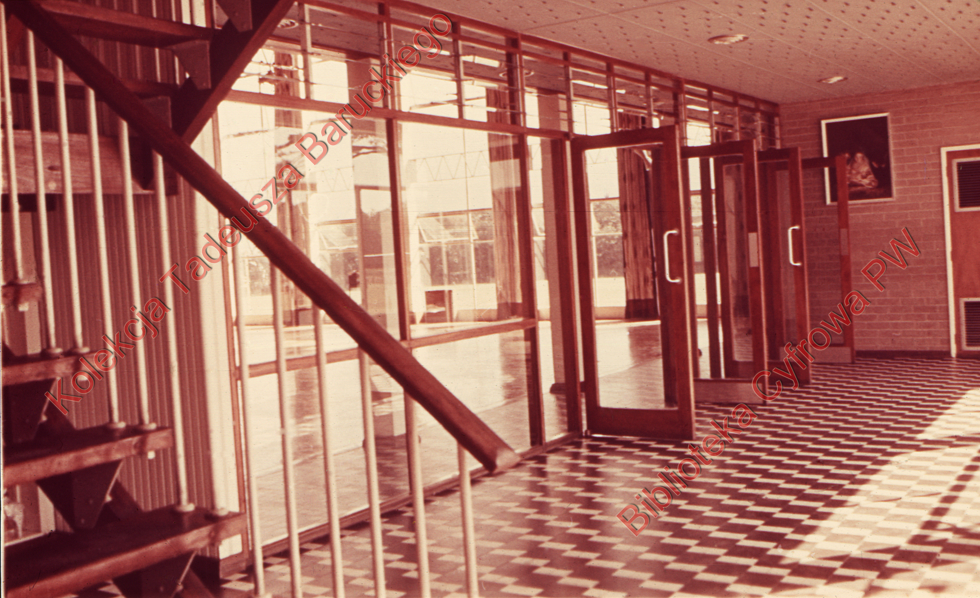 Szkoła II stopnia dla chłopców, wnętrze hallu pawilonu dyrekcyjnego, drzwi wewnętrzne, Hatfield, Anglia, Wielka Brytania