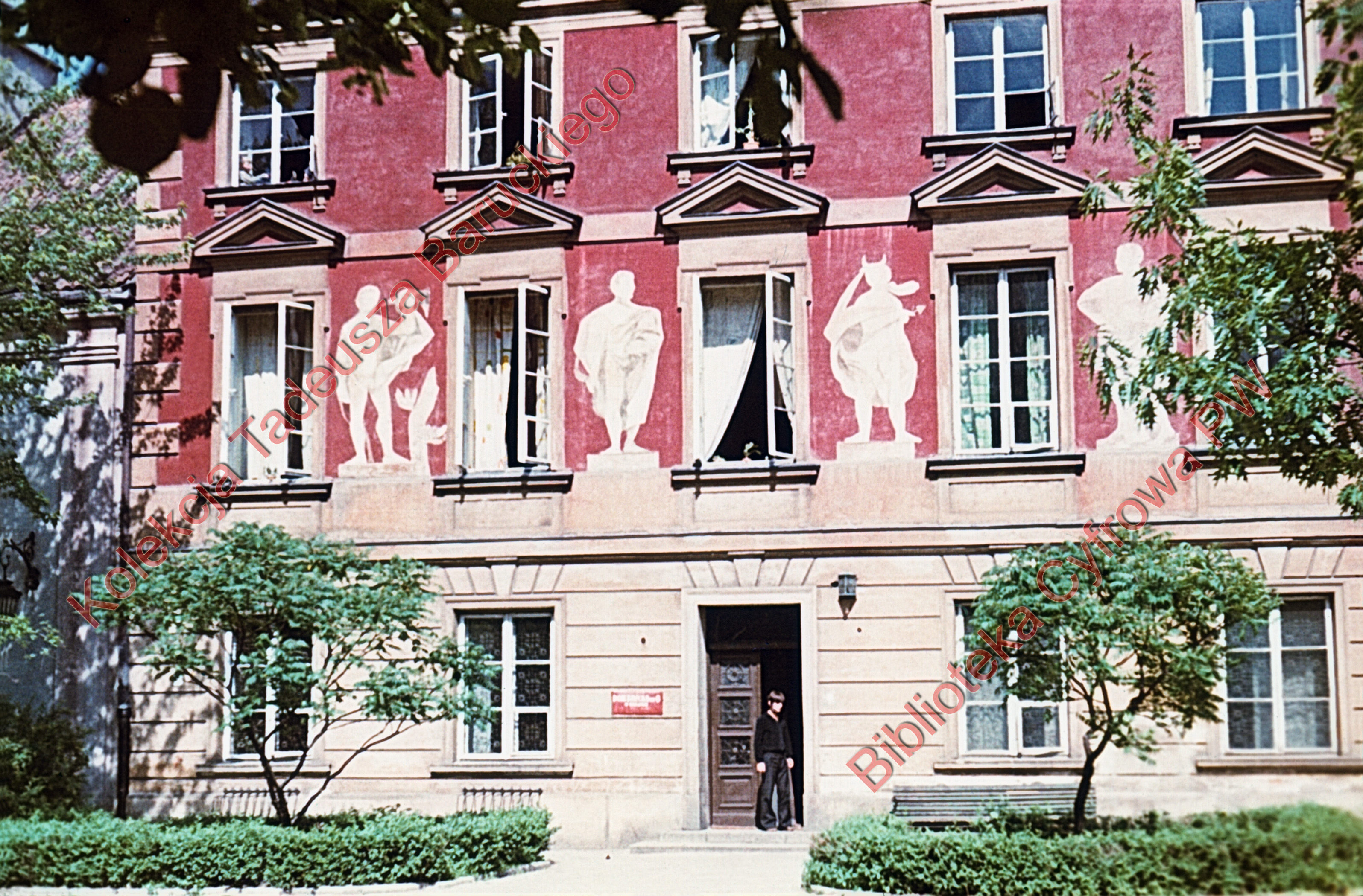 Widoczne malowidła naścienne i teren zielony przed wejściem do budynku.